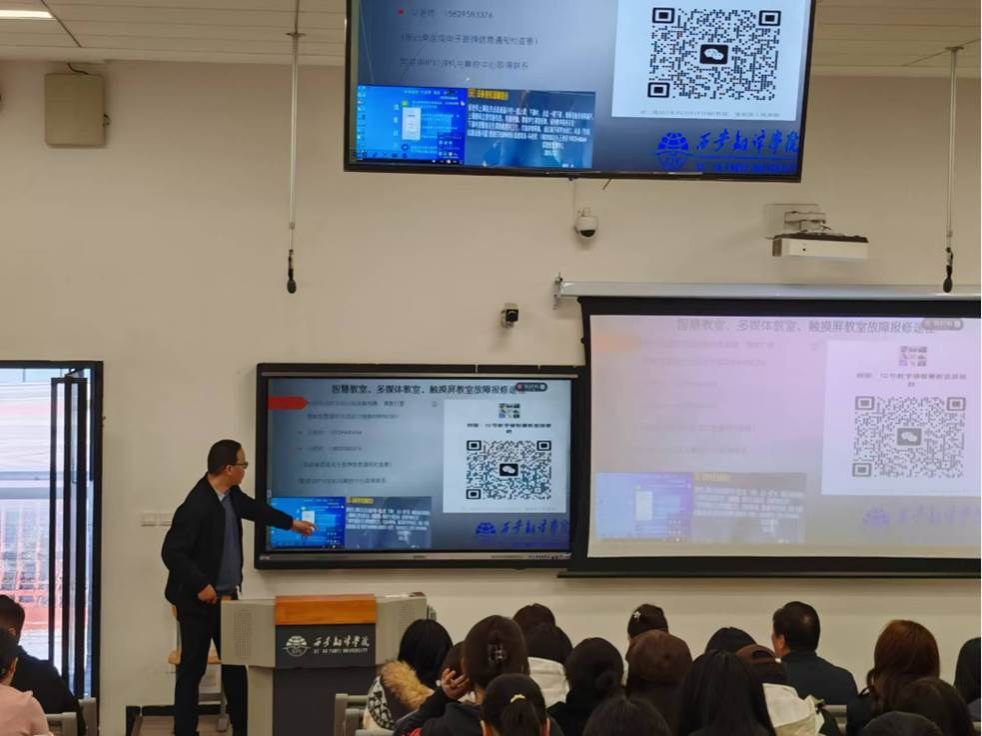 实验室管理中心王国林老师作了题为《智慧教室设备基本操作》的培训,他分别从智慧教室硬件、软件及教学管理平台使用三个方面做讲解,就如何通过智慧教室上一堂精品课,详细介绍了智慧教学平台软硬件的基本功能、操作技巧和应用方法。现场进行实操演示,重点讲解课前“一键上课”设备同步启动、课中常见故障快速排查与处置、课后规范关机等关键流程,明确操作标准,避免因违规操作造成系统异常和设备损坏。